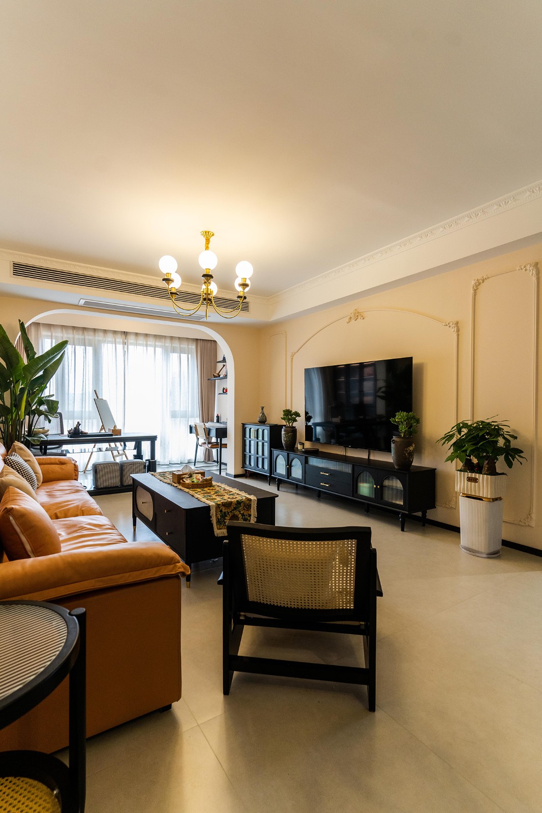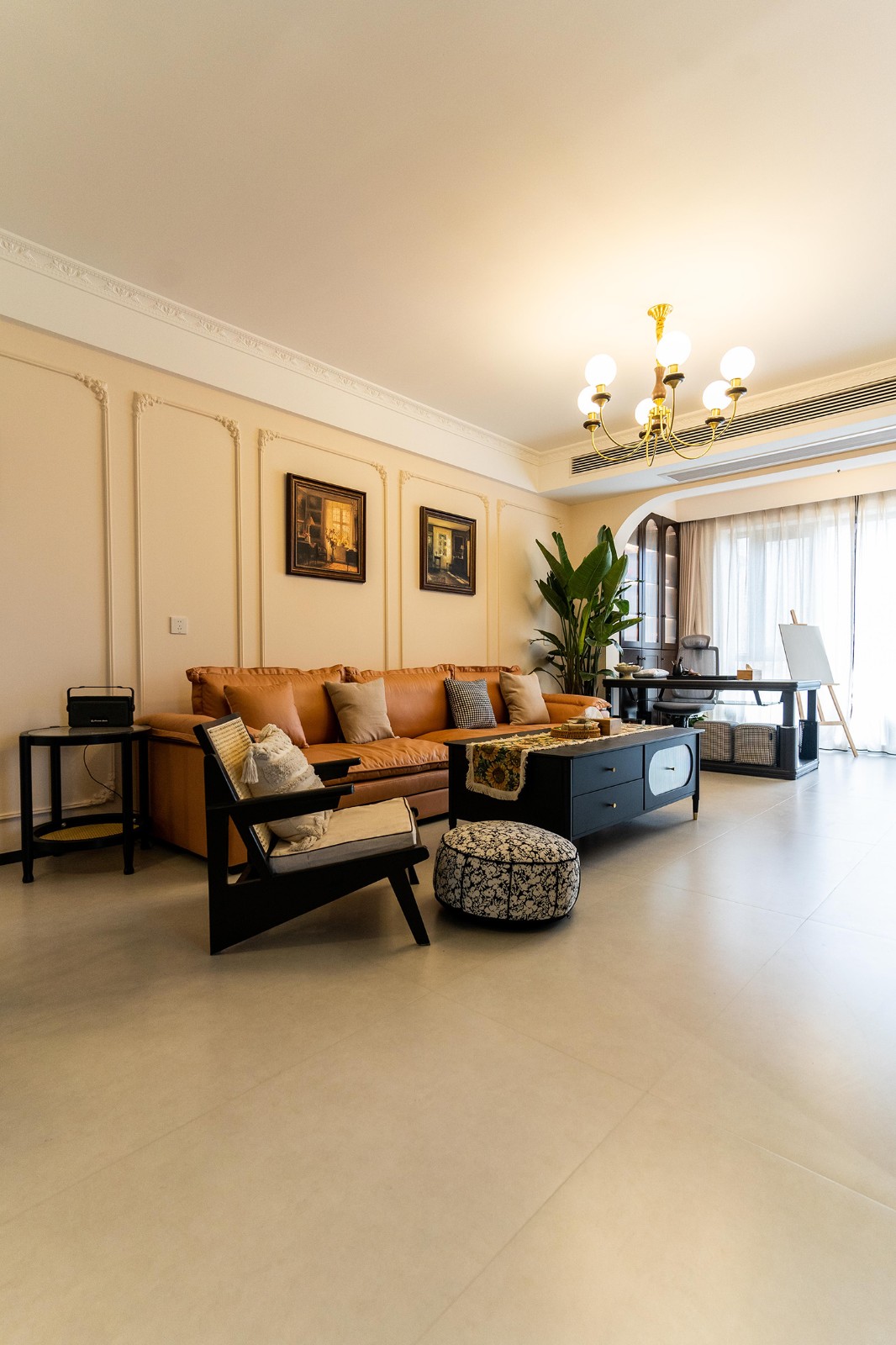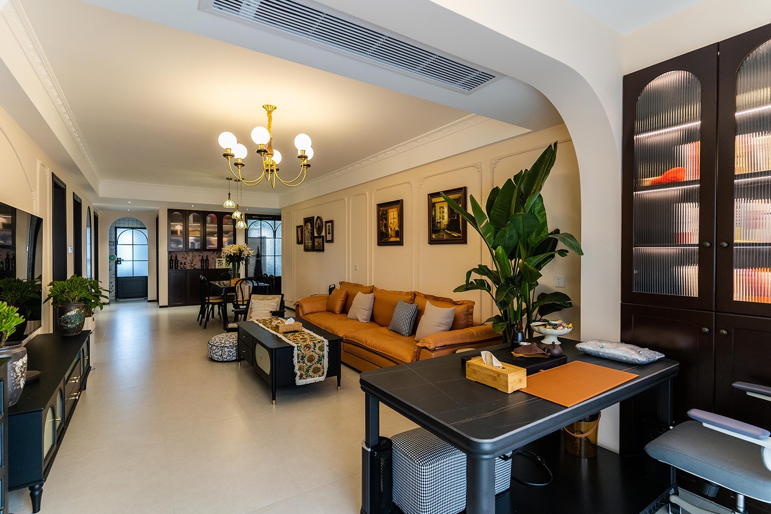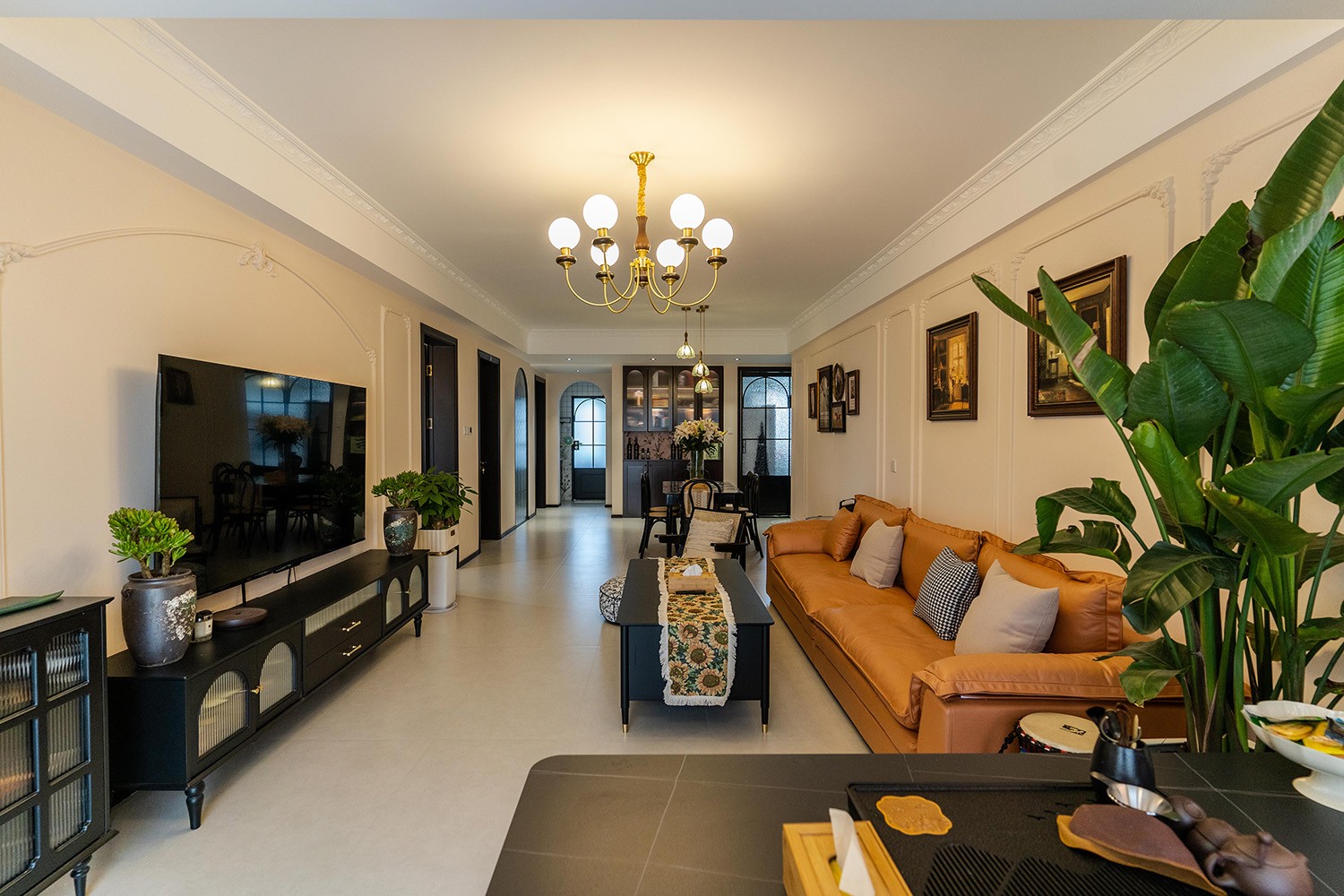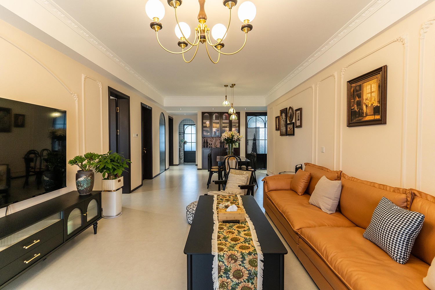 法式復古風格在山水文園113㎡的空間中,通過對色彩、材質、光影和造型的精準把握,打造出一個既有歷史沉淀又符合當代審美的理想居所。 軟糯的黑色沙發(fā),色彩與綠植形成呼應,與陽臺圍合成一處溫馨的生態(tài)空間。在快節(jié)奏、高強度的工作之余,為疲憊的身軀找到安放之處。復古的色調,仿佛是歲月沉淀的詩篇;細膩的紋理,講述著往昔的故事。吊燈投射出溫暖而柔和的光,照亮了角落里被遺忘的時光。 這不僅僅是一種設計風格,更是對生活方式的深度詮釋——在懷舊的底色中,描摹當代生活的浪漫想象;在復古的韻味里,安放現(xiàn)代人的詩意棲居。