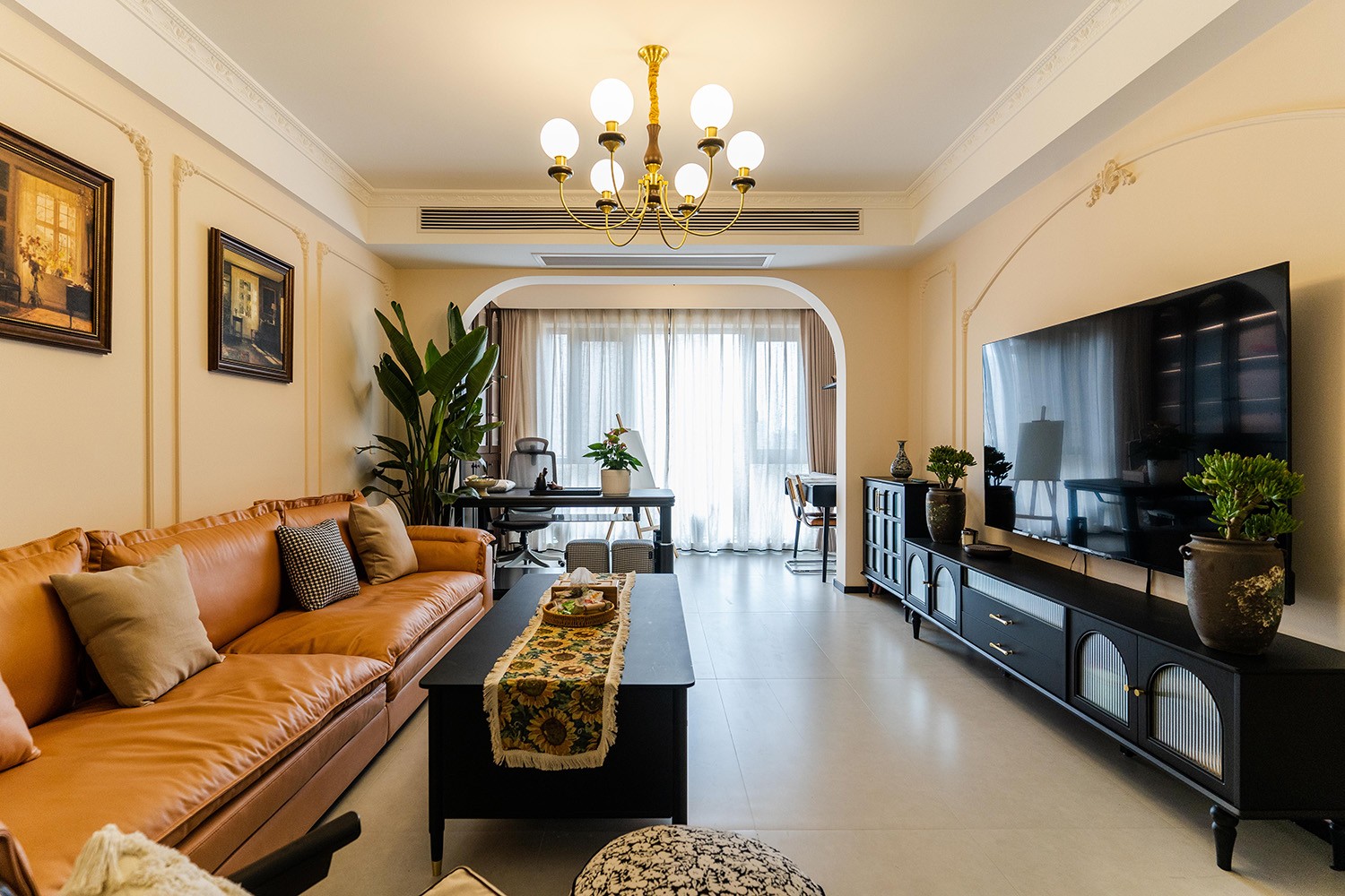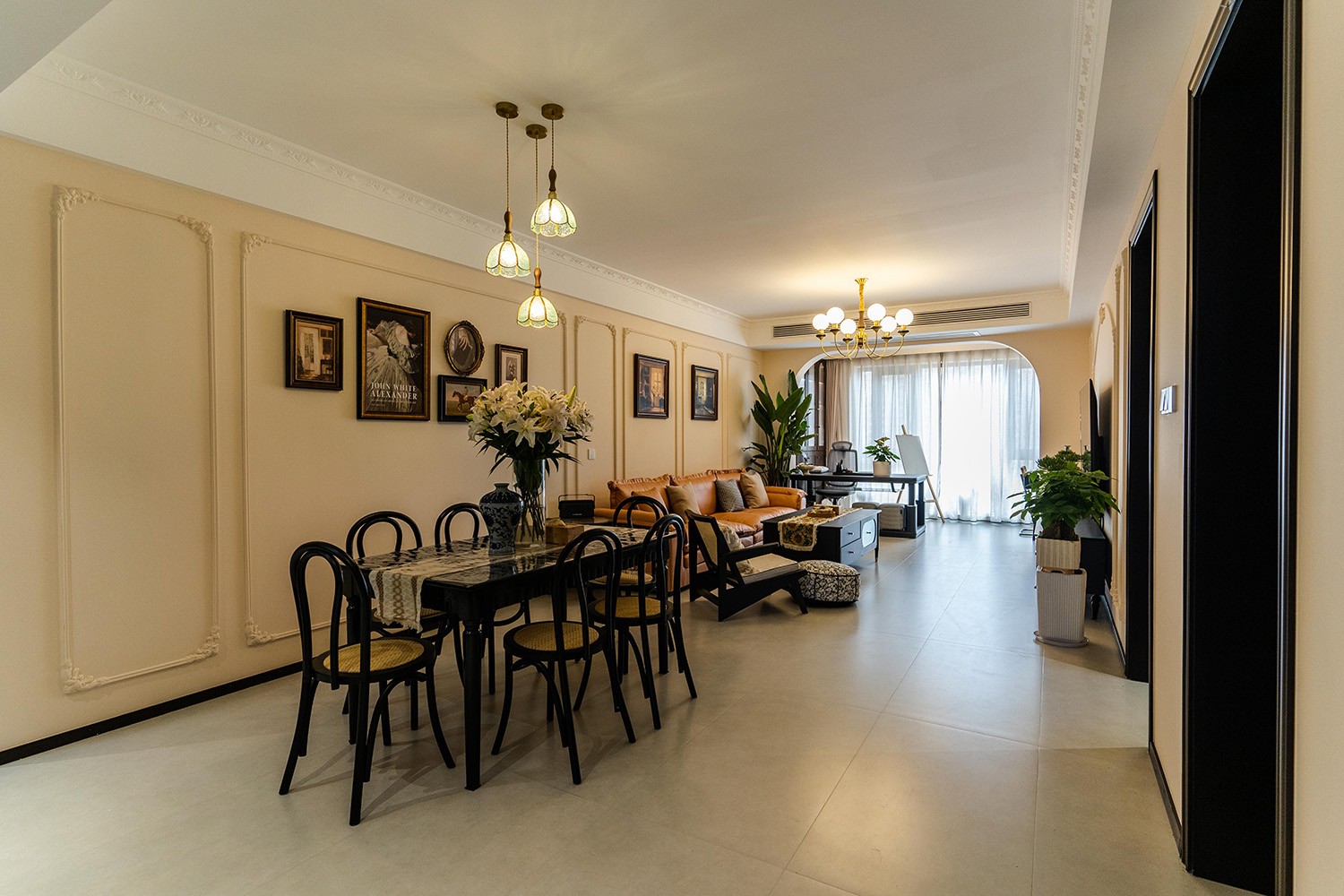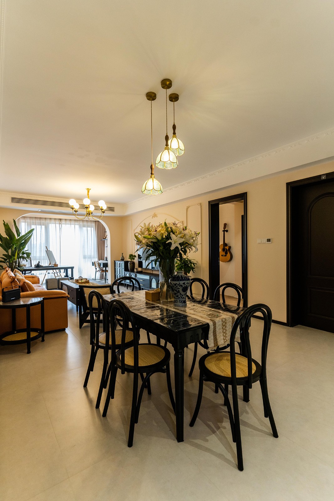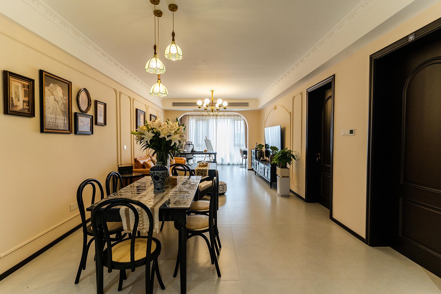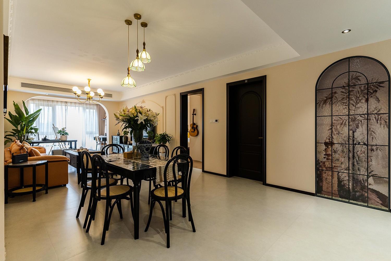 法式復古風格在山水文園113㎡的空間中,通過對色彩、材質、光影和造型的精準把握,打造出一個既有歷史沉淀又符合當代審美的理想居所。 軟糯的黑色沙發(fā),色彩與綠植形成呼應,與陽臺圍合成一處溫馨的生態(tài)空間。在快節(jié)奏、高強度的工作之余,為疲憊的身軀找到安放之處。復古的色調,仿佛是歲月沉淀的詩篇;細膩的紋理,講述著往昔的故事。吊燈投射出溫暖而柔和的光,照亮了角落里被遺忘的時光。 這不僅僅是一種設計風格,更是對生活方式的深度詮釋——在懷舊的底色中,描摹當代生活的浪漫想象;在復古的韻味里,安放現(xiàn)代人的詩意棲居。