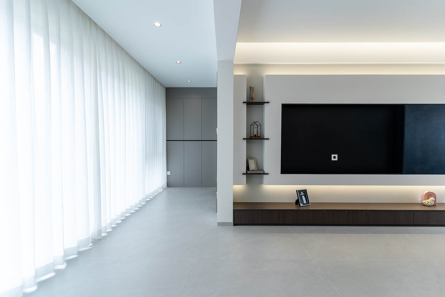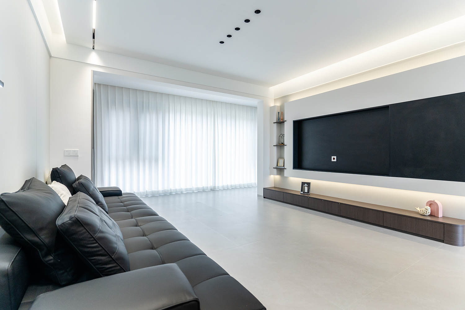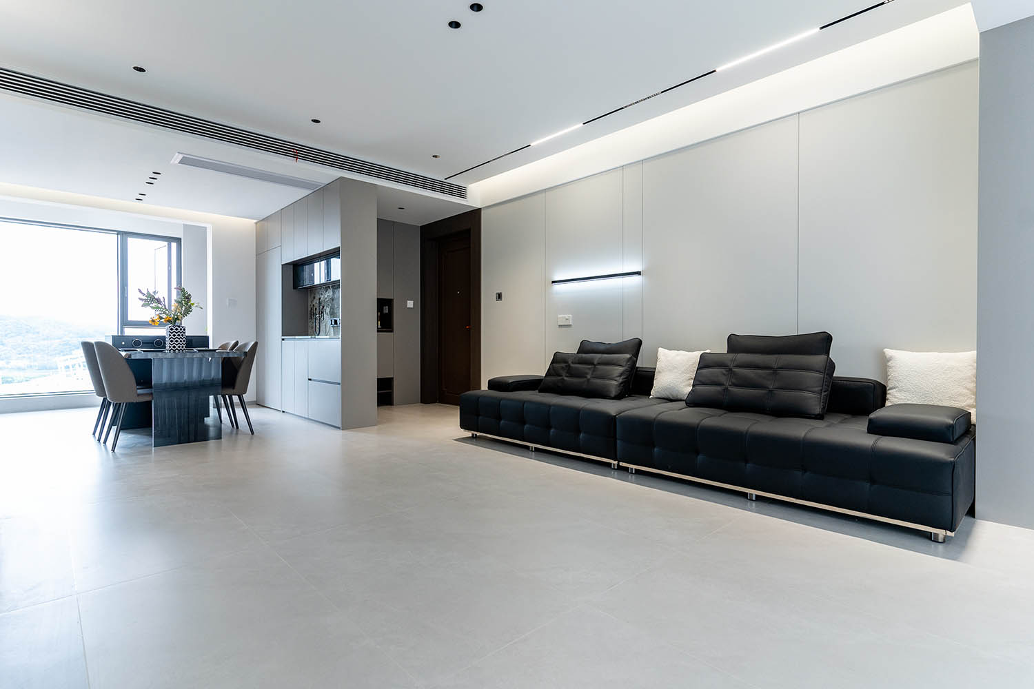 用黑、白、灰的經(jīng)典碰撞,詮釋意式極簡的「做減法的藝術(shù)」。沒有冗余裝飾,以利落線條、純粹色調(diào),讓空間回歸「實(shí)用與質(zhì)感共生」的本質(zhì),每一處都藏著 “用必要定義高級” 的設(shè)計(jì)智慧。 無主燈設(shè)計(jì) + 線性燈帶,讓光線柔和包裹空間;黑色皮質(zhì)沙發(fā)簡化形態(tài),與灰色背景墻呼應(yīng),詮釋意式「隱于簡的高級感」,舍去繁雜裝飾,還原空間本真互動場域。每一寸存在都值得被凝視,讓走過空間的人,忍不住贊嘆這份 “不動聲色的精致” 。
