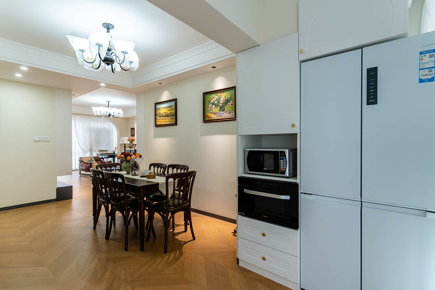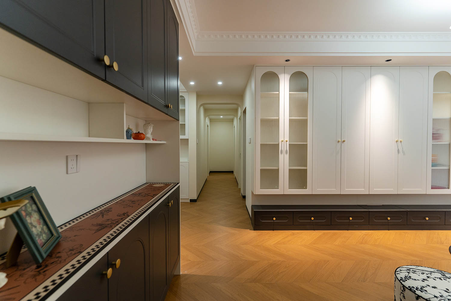 設(shè)計(jì)說(shuō)明: 本案為翡翠公園131㎡法式復(fù)古風(fēng)格住宅,以優(yōu)雅的雕花線條、柔和的色彩搭配和精致的復(fù)古元素,打造一個(gè)充滿浪漫情調(diào)與藝術(shù)氛圍的居住空間。設(shè)計(jì)在保留法式古典美學(xué)的同時(shí),融入現(xiàn)代舒適性,讓家既如巴黎公寓般精致,又符合當(dāng)代生活需求。 本案以法式復(fù)古為靈魂,通過考究的材質(zhì)搭配與細(xì)膩的細(xì)節(jié)處理,讓家成為一場(chǎng)永不落幕的浪漫盛宴。