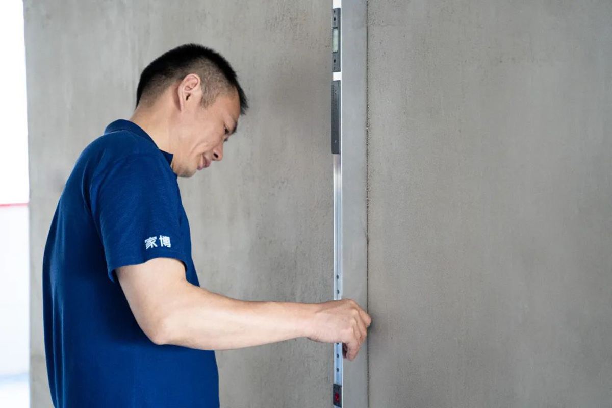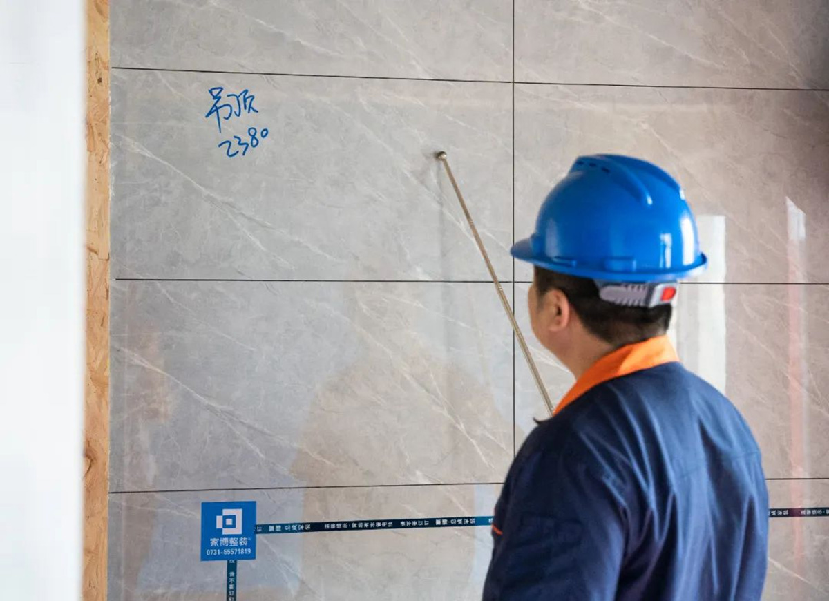 ▲質(zhì)檢組使用2米水平靠尺檢測(cè)墻面平整度。墻面的平整度是影響整體視覺(jué)效果最重要的因素之一,因此每一次巡檢,墻面檢查都是重中之重。